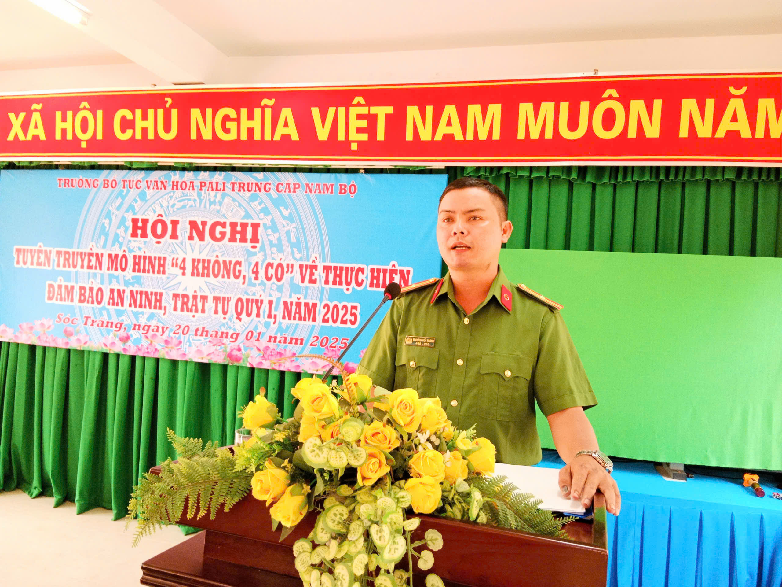 Sáng ngày 20/01/2025, Trường Bổ túc Văn hóa Pali Trung cấp Nam Bộ phối hợp với Ban Tuyên giáo Tỉnh ủy, Phòng Cảnh sát Giao thông, Phòng Tham mưu Công an tỉnh tổ chức Hội nghị tuyên truyền tình hình kinh tế xã hội năm 2024; tình hình an ninh trật tự, an toàn giao thông trong thực hiện mô hình “4 không 4 có” cho 219 cán bộ, viên chức và học viên của trường. Qua buổi hội nghị, giúp cán bộ, viên chức và học viên nhận thức được tình hình kinh tế, xã hội tỉnh Sóc Trăng năm 2024; công tác phòng chống tội phạm, tệ nạn xã hội; quy định an toàn giao thông. Từ đó ý thức rèn luyện, tu dưỡng trong công tác và học tập tốt góp phần nâng cao chất lượng giáo dục của nhà trường; đảm bảo an toàn, an ninh trật tự trường học; nghiêm chỉnh chấp hành Luật Giao thông, là điểm sáng điển hình tiên tiến trong Phong trào Toàn dân bảo vệ an ninh Tổ quốc. Bên cạnh đó, nhà trường cũng tuyên truyền cho học viên phát huy vai trò của người có uy tín trong đồng bào dân tộc thiểu số từ các vị sư, mỗi vị sư học viên là một tuyên truyền viên tích cực, là cầu nối quan trọng của chính quyền địa phương với đồng bào Khmer trong vận động đồng bào chấp hành tốt chủ trương của Đảng, chính sách, pháp luật của Nhà nước góp phần đảm bảo quốc phòng, an ninh, trật tự an toàn xã hội vùng đồng bào dân tộc thiểu số, nhất là trong dịp Tết Nguyên đán 2025.